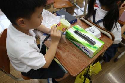 だんだん作品が大きくなってきて、ボンドでくっつけたりガムテープやテープで貼り合わせたりするときに倒れそうになったときには、友達とうまく協力して作っていました。動物さんの「くち」の部分をうまく動くようにしたくて、何度も修正しながら作っている子もいました。できた作品は、みんなのお気に入りになったようで、休み時間に持ち出して遊んでいる子もいますよ!