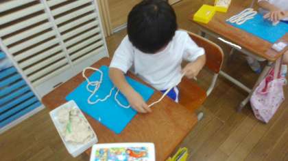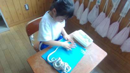 前回はねんどを使っていろいろな形を作りましたが、今回はひものように長くのばしていきました。どこまでもどこまでものばしていくと、机の上からはみ出してしまう子がたくさん出てきて、そのうちにぐるぐる巻いてかたつむりの形にしてみたり、へびのようにくねくねにしてみたりしていました。次はどんなものができるかな?
