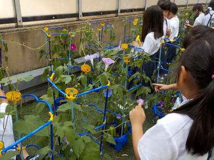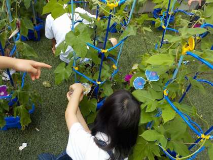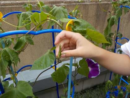 先週、何人もの子のアサガオが咲いていましたが、今週に入ってまた一段とアサガオの花が増えました。「ぼく10こも咲いたよ!」という子もおり、驚いてすぐにみんなで見に行きました。まだまだ咲いていない鉢もありましたが、たくさん咲いている鉢が増えてきました。7月に入って、アサガオも夏を感じたのでしょうか。夏本番になると、もっともっと咲くかな?ぼくたちわたしたちのアサガオ!