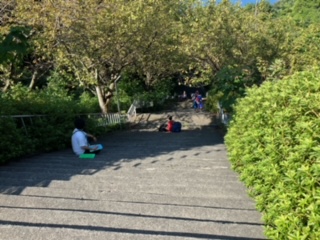 自然の家は海の近くで、施設の高低差が大きいです。バスまでの階段は160近く。がんばって上ります。