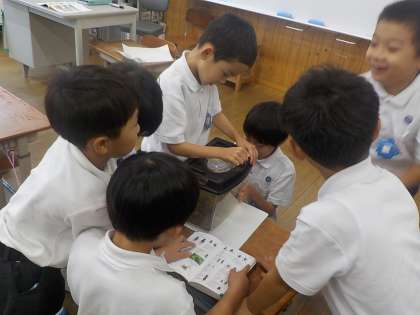 どんなえさが必要なのか、どんなお世話が必要なのかなどをグループで話し合ったり、本で調べたりしてバッタやコオロギ、ダンゴムシなどのお世話をしています。狭い虫かごの中でも、できるだけ元気にすごしてほしいと、休み時間に「おさんぽ」に出してあげたりしているようです。虫たちのことを大切に思う気持ちを、これからももち続けてほしいなと思います。