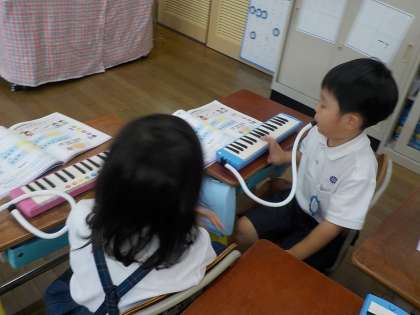 「どれみであいさつ」や「なかよし」など、複数の指を使う曲に挑戦しています。指の使い方を一緒に確かめたり、繰り返し練習したり、友達にアドバイスをもらったりしながら、少しずつ上達しています。友達が階名を歌ってくれたり、できたときに一緒に喜んでくれたりしているのを見ると、素敵だなと思います。これからも、学び合う友達のことを大切にしながら学んでいってほしいと思います。