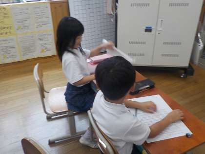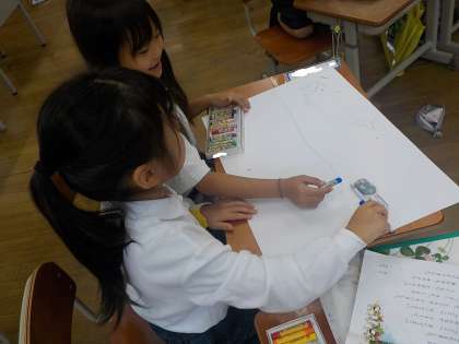 たくさん音読したくじらぐものお話を、学習の最後にどのように表現するか子どもたちは考えました。劇をしてみたい子、お話の場面を絵に描いて表したい子、くじらぐもにお手紙を書いてみたい子など様々おり、それぞれ自分の役割を決めて準備をし始めました。どのグループでも活発に話し合いをしていて、一生懸命な様子に感心しました。くじらぐものお話を最後まで楽しんでいきたいですね!