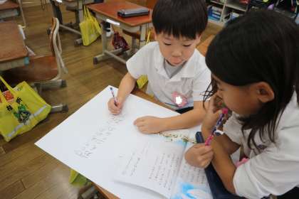 1年生は、国語で「くじらぐも」の学習をしています。一つ場面を決めてみんなの前で劇をするグループもいれば、紙芝居を作って見せようというグループもありました。劇の中にどんなセリフを入れたらよいかを相談したり、紙に字を書く人とチェックする人で仕事を分担してみたり、友達と話し合いながら準備を進めていく姿が素敵でした。本番はどんな発表になるのか、楽しみに待っているところです。