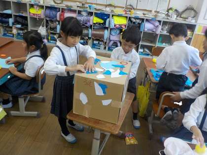 1年生は、体育大会で、4人でおみこしを運ぶ競技を行います。練習も残すところあと1回となったので、おみこしで使う箱を画用紙で飾り付けました。1年生みんなでがんばったので、素敵な仕上がりになりました。本番にこのおみこしをみんなで運ぶのが今から楽しみになっています。