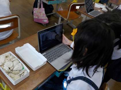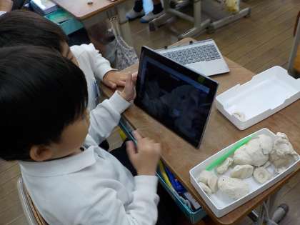 校内を校舎の中も校舎外もたくさん歩いて探して、お気に入りの「でこぼこ」をたくさん見つけることができました。見つけた「でこぼこ」をGIGA端末で写真に撮って、ロイロノートでみんな一つずつ提出することにしました。これまで作った自分の「コレクション」を眺めながら、「どれにしようかなぁ」と悩む子も入れば、一つだけでは飽き足らず「もう一つ入れていい?」と言っている子もいました。みんなのお気に入りを共有して見られるにして友達の作品を鑑賞する時間をととると、みんな興味深げに作品をいろいろ見て楽しんでいました。