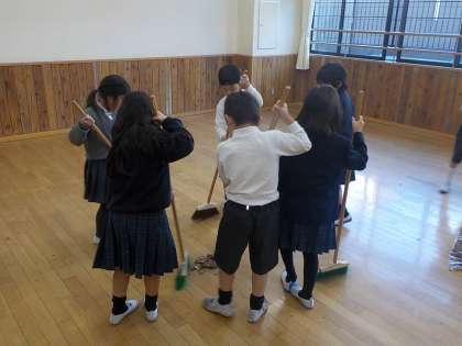 オープンスペースで落ち葉遊びをして楽しんだら、オープンスペースが木の葉まみれになって、さあ大変。片付けも一苦労、と思ったのですが、何人もの子がほうきを持ってきてどんどん片付けていきます。最後の葉っぱ1枚まできれいさっぱり掃除をすることができました。普段から掃除時間を楽しみにしているくらいお掃除が大好きなので、お片付けまできっちりできていました。最後まで、自分たちでがんばろうとするところに、成長を感じます。