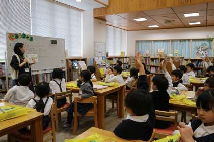 この日は、昔話の学習をしている関係で、司書の先生が「ももたろう」の本を紹介してくださいました。「ももたろう」のお話を知っている子はたくさんいましたが、いろんな種類の「ももたろう」があることは知らず、みんなとてもびっくりしていました。「ももたろう」以外のお話でも、比べることができるかもしれないですね!