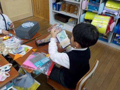 箱のまわりをきれいな紙を貼ってみたり、リボンやビーズをつけてみたり、ひもを取り付けて新たに取っ手を作ってみたりする子もいれば、自分の家で小物入れとして使う箱に「歯」をつけたり、「目」をかいたりして、ワニ型の小物入れを作っている子もいました。出来上がったときに何を入れるか、想像を膨らませながら楽しく作っているところが素敵だなと思いました。