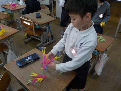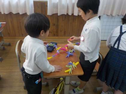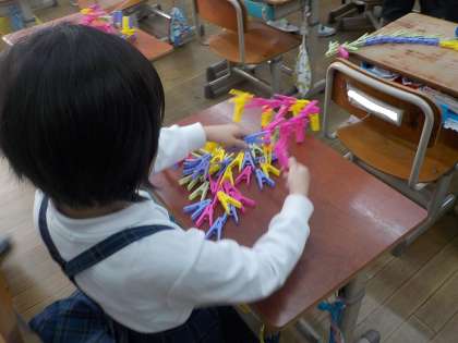 たくさんの洗濯ばさみをつなげてどんな形になるのか、これまで遊んできました。一人で考えて作ったり、友達と協力して作ったりしていましたが、この日は一人でどんな形ができるのか、思い思いに楽しんでいました。洗濯ばさみがいろいろな方向につなげられて、一人一人のオリジナルな作品が出来上がっていました。