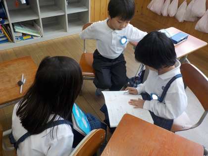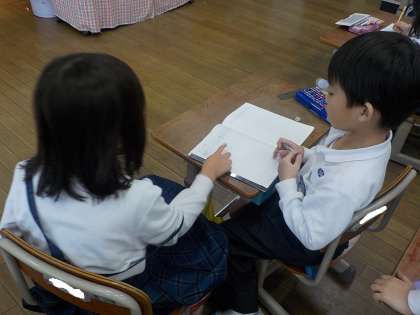 図を描きながら、何番目か考える問題などに取り組みました。図をかいても、それをうまく使って考えるのは難しいようで、友達と話し合いながらどう考えればよいのかを交流して理解を深めました。図を描いたり、印をつけたり、数えたりしながら、たずねられていることにうまく答えられるようになるといいですね!