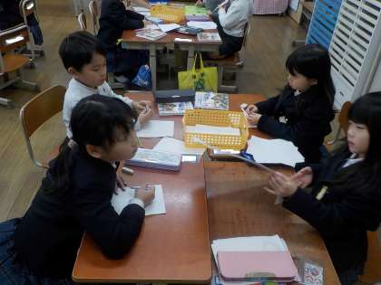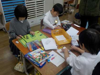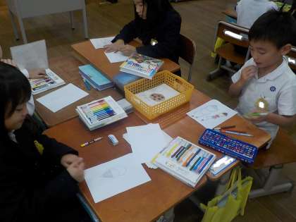 グループの友達と相談しながら、お店やさんに並べる「しなもの」を一生懸命紙にかいています。たくさんのお客さんに来てもらえるように、看板も考えてかいていました。お店屋さんごっこの当日が、今から待ち遠しいですね!