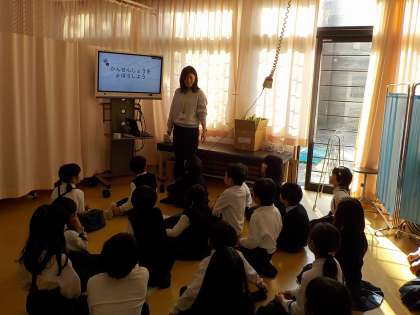 身体計測の前に、「かんせんしょう」を予防することの大切さと、どうやって予防するかについて養護教諭からお話を聞きました。手洗いするときにハンカチを使ってきちんと水分をふき取ることや、換気をするときに窓側と合わせてドア側も開けて空気が通りやすいようにすることなど、大事なことをたくさん教えていただきました。教室に帰ってからも、