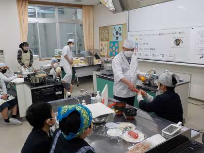 5年生は京料理人の梶憲司さんをゲストティーチャーにお招きして、和食の学習を行いました。初めに食材の紹介がありました。実際に手にとって、その見た目の特徴を見つけたり、香りをかいでみたりしていました。かつおぶしを手に取った時には、その硬さに驚いた様子を見せていました。