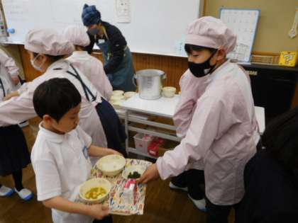 今日から給食も始まりました。準備には4年生のお兄さんお姉さんが来てくれました。いただきます!と元気よく食べ始めると,「ほうれん草苦手だけど美味しい!」「もっと食べたい!」と言っていました。来週はどんな給食かな?準備や片づけにも少しずつ慣れていきましょうね。