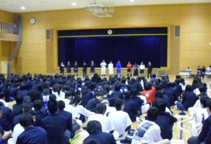 年度当初恒例の生徒会による生徒会紹介ならびに部活動紹介が行われました。吹奏楽はピンクレディのペッパー警部等を演奏し、踊りや歌まで飛び出しての大サービス。