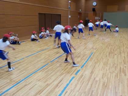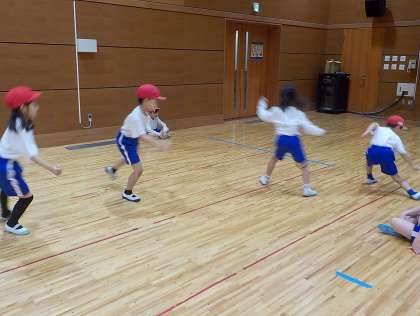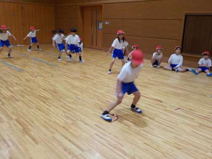 この日は『反復横跳び』に挑戦しました。初めての動きだったので、戸惑う人もいましたが、体を素早く動かすのが面白かったのか、みんな楽しんで取り組んでいました。初めての挑戦だったわりには、上手に反復横跳びできていたように思います!来年も楽しみですね!
