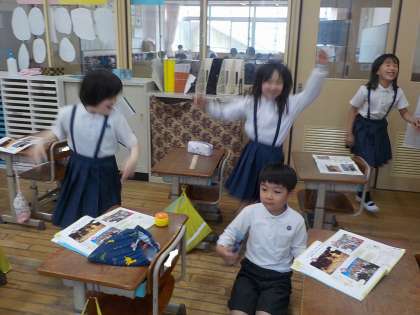 『ティニクリン』『エースオブダイヤモンド』『とうしんドーイ』など、世界のいろいろな地域の音楽を聴いて楽しみました。聴いていると、どうしても体がうずうずして踊りたくなる2年生たち。毎度ダンスタイムを作って友達と踊っていました。三線(さんしん)の音色に触発されて、「エア三味線?」を弾きだす子がいたり、曲に合わせてくるくる回ってみる子がいたり、子どもたちは、音楽を楽しむのがとても上手だなぁと毎回感心します。