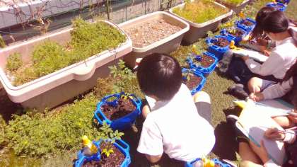 先日植えたトマトの苗を「早く見に行きたい!」ということで、中庭に観察しに行きました。葉っぱの枚数を一生懸命数えてみたり、においをかいだり触って確かめてみたりしながら、観察タイムを楽しんでいました。ぐんぐん育ってくれるといいですね!