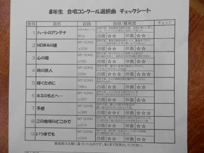 選択曲9曲を聞き比べて,クラスで歌いたい曲をアンケートで答えました。