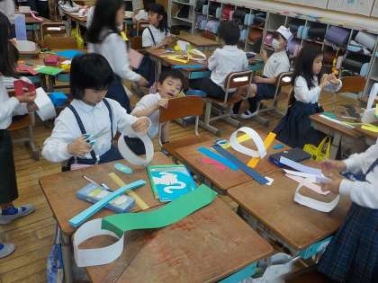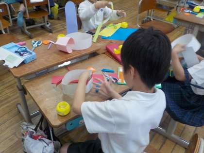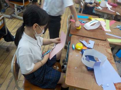 2年生は、図工で「わっかでへんしん」の学習を進めていました。