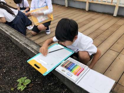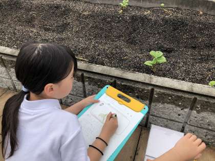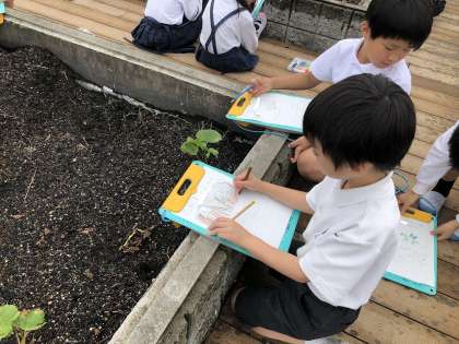 先日植えたサツマイモの様子を観察しに屋上に行ってきました。子どもたちは、葉っぱの形やくきのうねり具合などに着目して、よく観察して絵や文で記録をしていました。国語で学習した「かんさつ名人になろう」が生かされているなぁとうれしくなりました。この調子で、みんなに「かんさつ名人」になってほしいな、と思います。