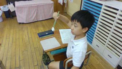 ティッシュをふんわり丸めて薬指と小指を使ってもち、おはしを片方だけ使って、正しく持ったり動かしたりしました。指だけで動かすのは難しかったらしく、「動かない!」と困っている子もいましたが、だんだんとコツをつかんで上手に動かす子も出てきました。おはしでティッシュをはさんだり、すくったり、ひっくり返したり、いろいろな動作にも挑戦しました。おはしの正しい持ち方と上手な動かし方を意識して、これからの生活に生かしてくれたらと思っています。