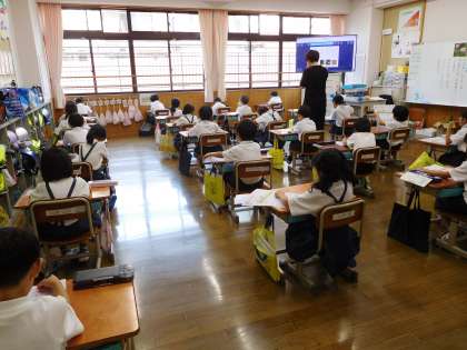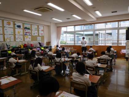 1年生の学習も進み,国語や算数ではノートを使った授業も始まりました。学習の理解や定着を図るため,テストに向けてまずはプリントを使って練習です。テストの体形や準備など,1年生にとっては初めてのこと。先生が問題文を読み,その後問題を解きました。