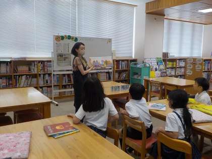 この日は司書の先生がパット・ハッチンスの「おまたせクッキー」を読んでくださいました。おやつにお母さんが焼いたクッキーを食べようとすると、ピンポーン!玄関のベルが鳴って、つぎつぎに友だちが増えていき…、というお話で、友だちが増えていくたびに子どもたちが声をあげて笑っていました。繰り返しを楽しめるのは、絵本の醍醐味です!