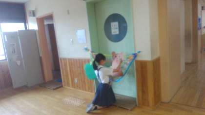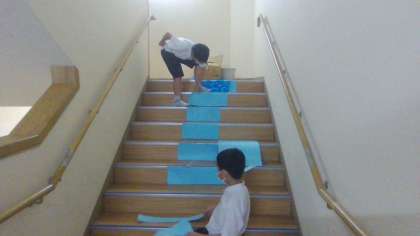 図画工作科の学習で、いつもの場所をちがう場所に変身させています。色や形などの場の特徴を生かし、想像したことを表します。いつもの場所が子どもたちのアイデアで楽しい場所に変身していきました。