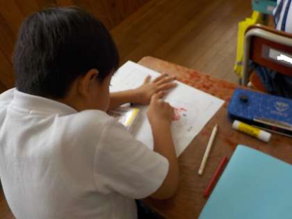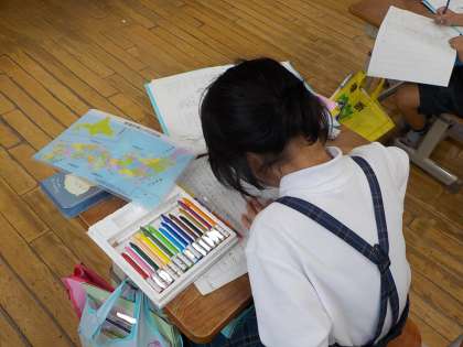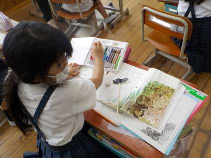 「スイミー」の物語を読んで、自分のお気に入りの場面について、どうしてその場面が好きなのかを文章で書いてまとめました。よく考えて自分の考えを書いた後、自分の好きな場面の絵も描いて添えました。