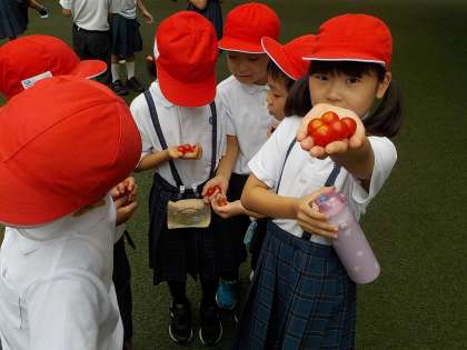 2年生は、生活科でミニトマトを育てていました。すずなりになったトマトが、真っ赤になってきたので、みんなで収穫していました。みんなおいしく食べたのかな?