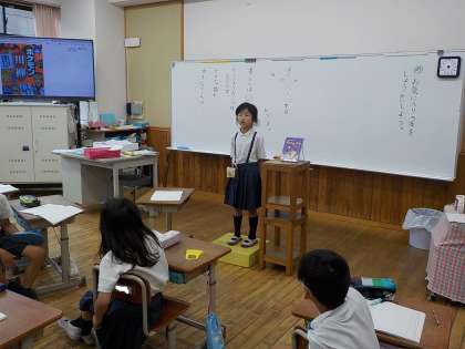 自分のお気に入りの本について、クラスのみんなに、どんなお話なのか、どんなところがすてきなのかを聞いてもらいました。同じシリーズの本が好きだったり、聞いたことのある作者だったり、友達が紹介する内容に驚いたり、いろいろな発見があったようです。夏休みの間に読む本を選ぶときの参考になればいいな、と思います。みんな、夏休みにたくさん本を読んでいるかな??