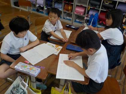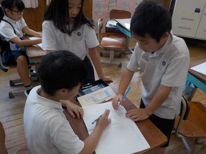 98円のパンを5つ買うときに、500円をもっていたら、5つとも買えるのかどうかをみんなで考えていました。地道になんとか98円ずつたそうとしてみたり、100のまとまりに分けて考えてみたり、子どもたちなりに言葉を尽くしながら考えていきました。自分の考えを伝えるべく、一生懸命友達に語りかけるなど、2学期のはじめからとても積極的な様子が見られて、とてもうれしかったです!