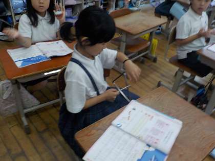 2年生は、音楽で「リズムをかさねて楽しもう」という学習を進めています。『いるかはざんぶらこ』という曲に合わせて3拍子のはくで打楽器でリズムをうって楽しみました。たくさん歌って楽しんだ後、手でリズムをうったり、トライアングルやカスタネットでリズムをうったりしました。リズムがとりやすいように、トライアングルの音の響かせ方を工夫する子もいて、よく考えているなぁと感心しました。