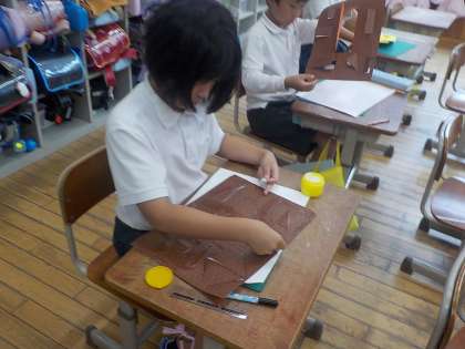 前回、どんな窓を開けるか決め、カッターナイフで切り開くところに線を引きました。今回は実際に切って窓を作っていきました。小さい窓もあれば大きい窓もあって、どんなものが出てくると楽しそうか想像を膨らませながら窓を切り開いていきました。画用紙の向きを器用に回しながら、ジグザグの線や曲がった線も丁寧にカッターナイフで切っていました。たくさん練習した成果が出たように思います。