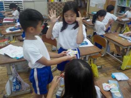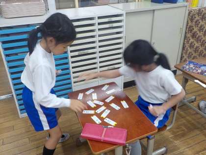 九九も2の段から5の段までを一通り学習したので、九九をばっちりおぼえられるようにそれぞれが練習しています。一人でひたすら唱えて覚える子、友達と読みあって答え合う子、友達に九九をばらばらに言ってもらってクイズのように答える子、カードを机の上に並べてカルタ遊びしながらおぼえる子、などなど。いろんな形でたくさん練習していることもあり、バラバラの九九でも即座に答えられるようになってきた子が出てきました。九九は今後の算数・数学の学習でたくさん使っていくので、自由自在に操る力を、今、つけておいてほしいと思います。