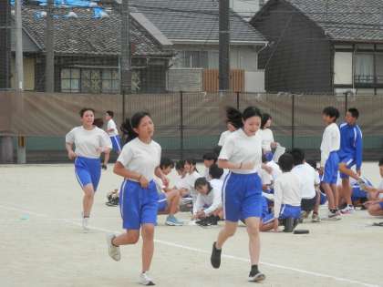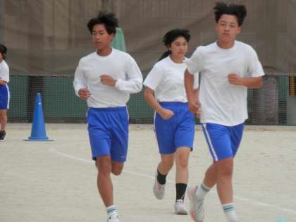 体育大会が終わり、保健体育の授業では、持久走が始まりました。今日は、10分間走でした。ペアを組んで、トラックの50mごとにコーンがおいてあり、走っていない方の人が、距離を確認します。「残り1分〜!」「あと30秒〜!」の声に、ラストスパートをかけています。