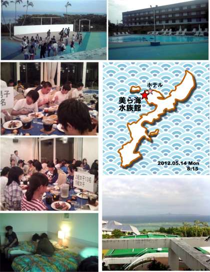 上の写真は,ホテルの外観と昨夜の様子です。御飯を何杯もおかわりする男子生徒,デザートのサータアンダギーにはまる女子生徒……食欲も旺盛なようです。