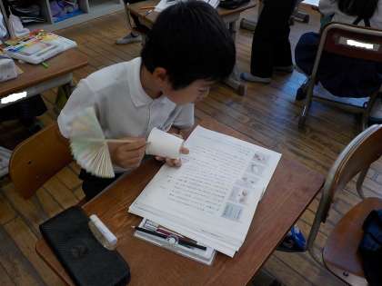 教科書に載っている「紙コップ花火」の作り方を読んで実際におもちゃを作ってみました。書いてあることだけをたよりにおもちゃを作るのは、なかなか難しいかな、と勝手に思っていましたが、子どもたちは大人の心配をよそに教科書とにらめっこしながらどんどん作っていきました。時にはうっかり読み飛ばして、「あれ、これ違うやん」「幅1cmやったん!?」と気づいてやり直したり、「テープはるの忘れてた!」と途中で気づいたりして、教科書を読みながら試行錯誤して進める姿が見られました。