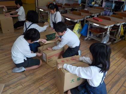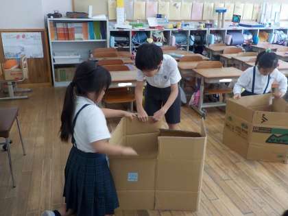 2年生は、図工で「ダンボールに入ってみると!?」という学習を進めています。グループごとにダンボールを使って自分たちが入れる何かを作っていきます。ガムテープを上手に使って、友達と協力しながら箱を作ったら、みんな変わる変わる箱の中にすっぽり入って、にっこり楽しんでいました。さてさて、どんなものができるのでしょう?