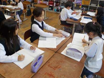 前回は、教科書を読みながら実際に紙コップ花火を作っていきました。作る上で、とても重要な情報が説明文の中にたくさん含まれていたので、どんな言葉に気をつけながら「紙コップ花火」を作っていったのかをみんなで集めて確かめました。「1センチメートル」「半分」といった大きさや数に関わる表現、「谷おり」「山おり」「はし」「外がわ」「内がわ」「真ん中」といった場所や向きに関わる言葉などで詳しく書かれていることで、説明書として成り立っていることが分かってきました。