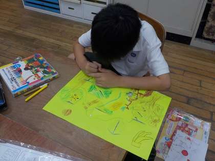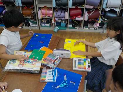 開いた窓の中に絵も描けたので、外側をペンや色紙で仕上げていきました。テーマが「宝物」なのでまわりを金色の色紙で飾ってみたり、水や葉っぱの模様をたくさん描き入れたり、画用紙にたくさんの絵を描いたりしていました。みんな自分の想像をいっぱいふくらませて作品を作ることができたのではないかなと思います。