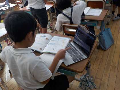 おまつりのリズムづくりをする際、教科書のQRコードを読み取ってデジタル上でいろいろなリズムのカードを操作して、音楽を作ってみました。カードを入れ替えて、ああでもない、こうでもない、と言いながら思い思いのリズムが出来上がりました。みんなで聞き合って、口で言ってみたり、手でそのリズムをたたいたりして楽しみました。
