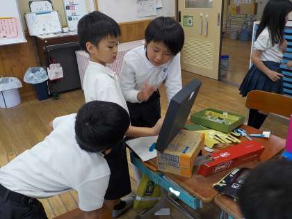 ゴムの力を使って、紙コップを高くとばす方法を研究しているグループは、またさらに高くとばす方法を開発したようでした。磁石の力でものを動かすグループでは、盤面の上で遊んでもらうおもちゃの角度を変えて遊びやすさを高める工夫をしている子もいました。とはいえ、もう校長先生と約束の「納品日」が近づいています。完成に向けてがんばるぞ!!