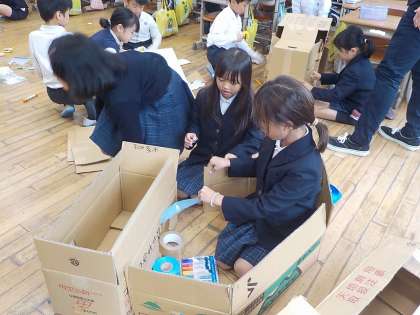 グループの友達と、「家」「電車」「のぞきばこ」「ロボット」など、上手に穴を開けながら協力して作っていきました。みんなで出来上がった作品を見合いっこするのも楽しかったですね!