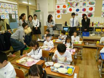 その後、1年生が給食の準備をしているところや、食事をしている様子を参観。おうちでは、好き嫌いをしているのに、学校では友達としっかり食べている姿にうれしい驚きですとおっしゃる方も。一年生、よくがんばっていますよ。