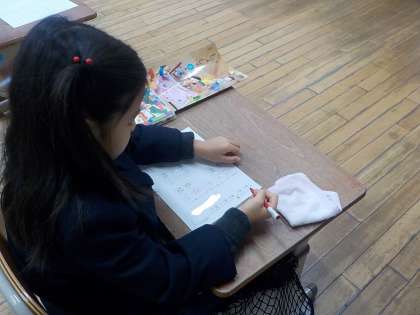 画の長さや、漢字を構成するパーツ同士の間隔に気をつけながら書いていました。「朝」「顔」など画数が多くてバランスをとるのが難しい字もありましたが、お手本を見ながら丁寧に書いていました。書き終わったものを自分で赤でコメントを入れてみると、具体的に直すべきところを書けている人もたくさんいて、感心しました。
