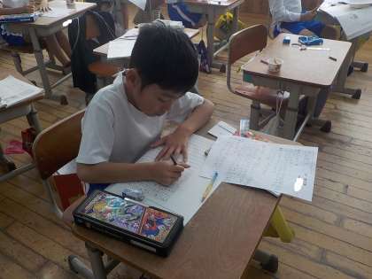 自分のおもちゃの作り方の下書きができたので、清書したり、必要な挿絵を付け足したりしています。とても思い入れをもって作ったおもちゃだったので、みんなのまなざしが真剣そのものです。