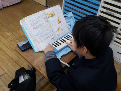 1年生の時も歌った『こぎつね』の曲を、鍵盤ハーモニカでも演奏し始めました。指の動きがはやくて、苦戦している子もいますが、同じ旋律が繰り返されるので少しずつ指の動きに慣れてきた子もいます。鍵盤ハーモニカで、いろいろな曲が演奏できるようになるといいなと思います。
